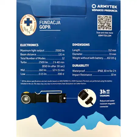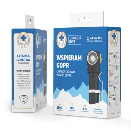 Wysokiej jakości czołówka w limitowanej serii wspierającej GOPR. W zestawie uchwyt rowerowy, opaska na głowę oraz uchwyt na pasek. Zestaw zawiera akumulator 18650 jak i ładowarkę USB. Przydatnym wyróżnikiem jest praktyczny uchwyt magnetyczny.